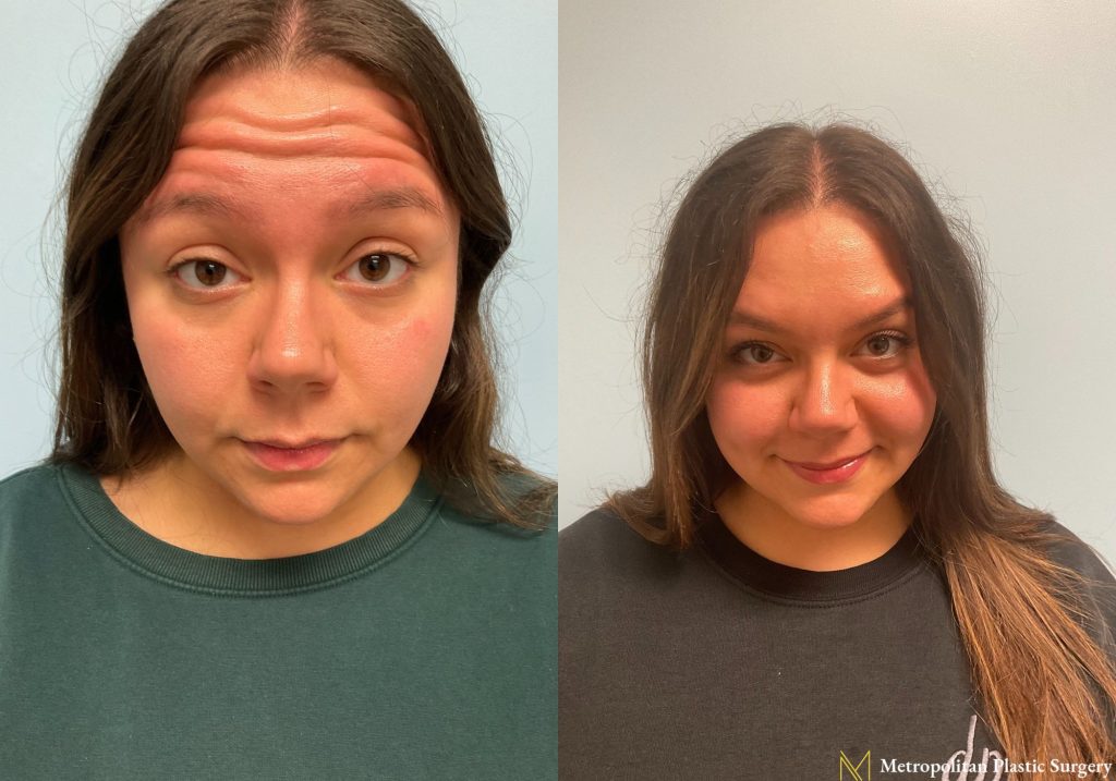 This 24 year old female came into the office for a Botox treatment. Our nurse Kelsey injected 20 units into her forehead and glabella to give her this beautiful result.